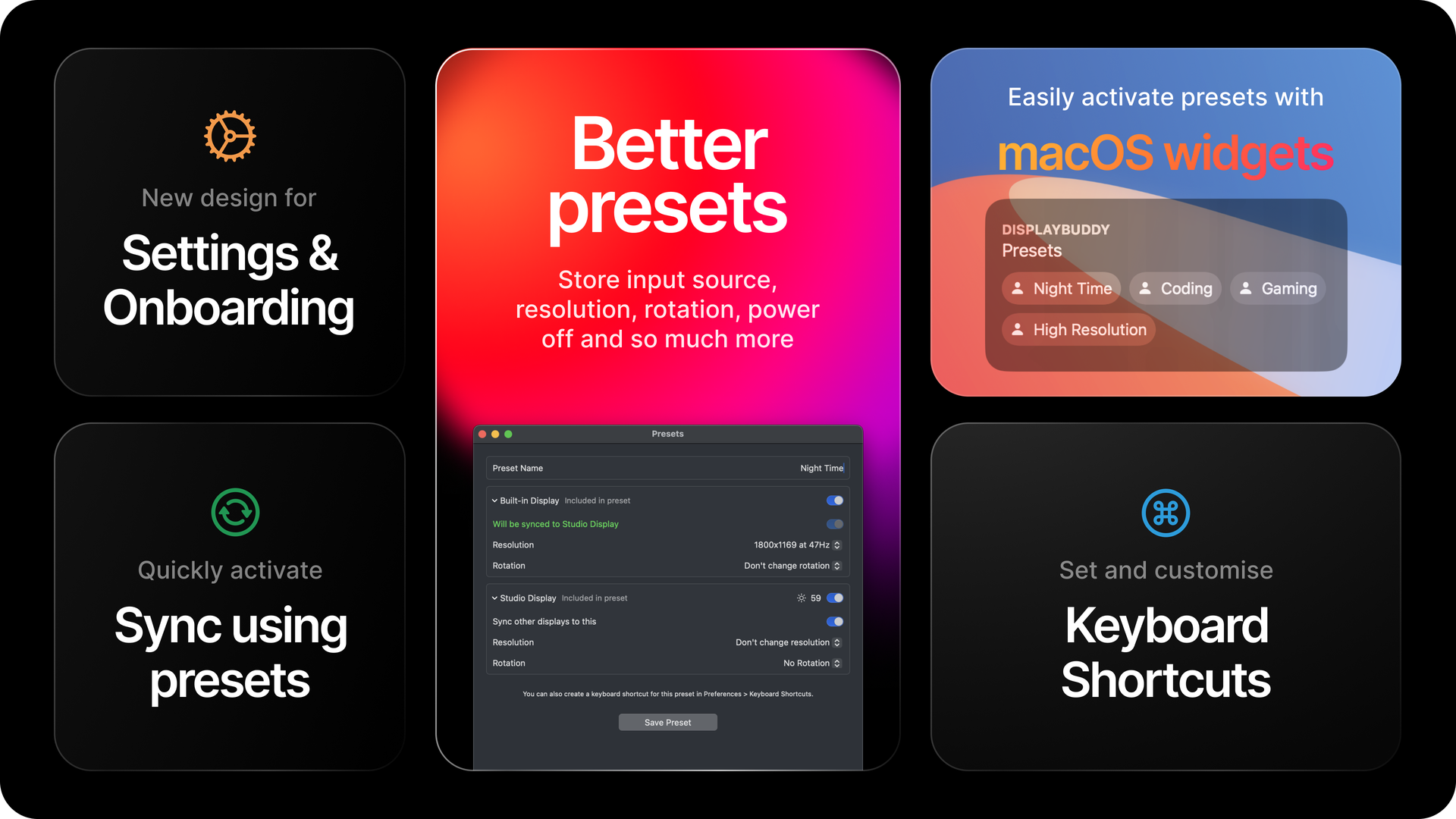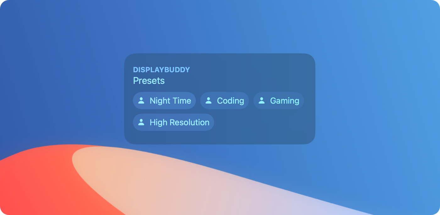 - On top of that, you can set custom keyboard hotkeys (in DisplayBuddy Preferences) or activate Presets using Siri and Mac Shortcuts.