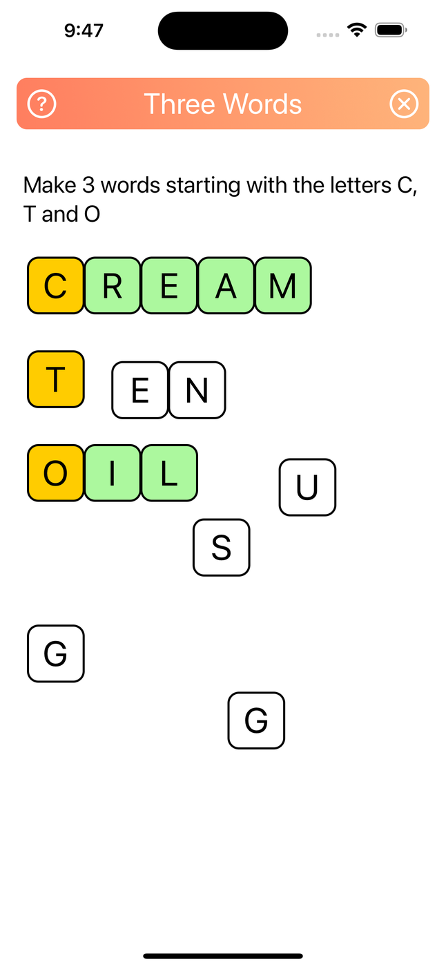 Three Words - is the first of the new daily games. In this game the player must create three words using the supplied letter tiles BUT they must start with a specific letter.