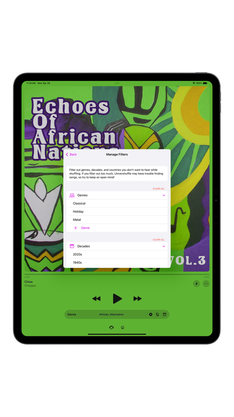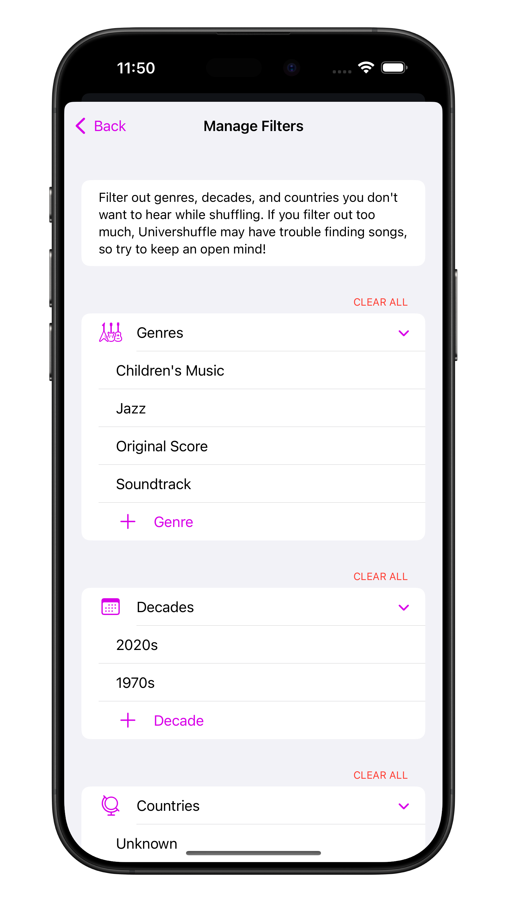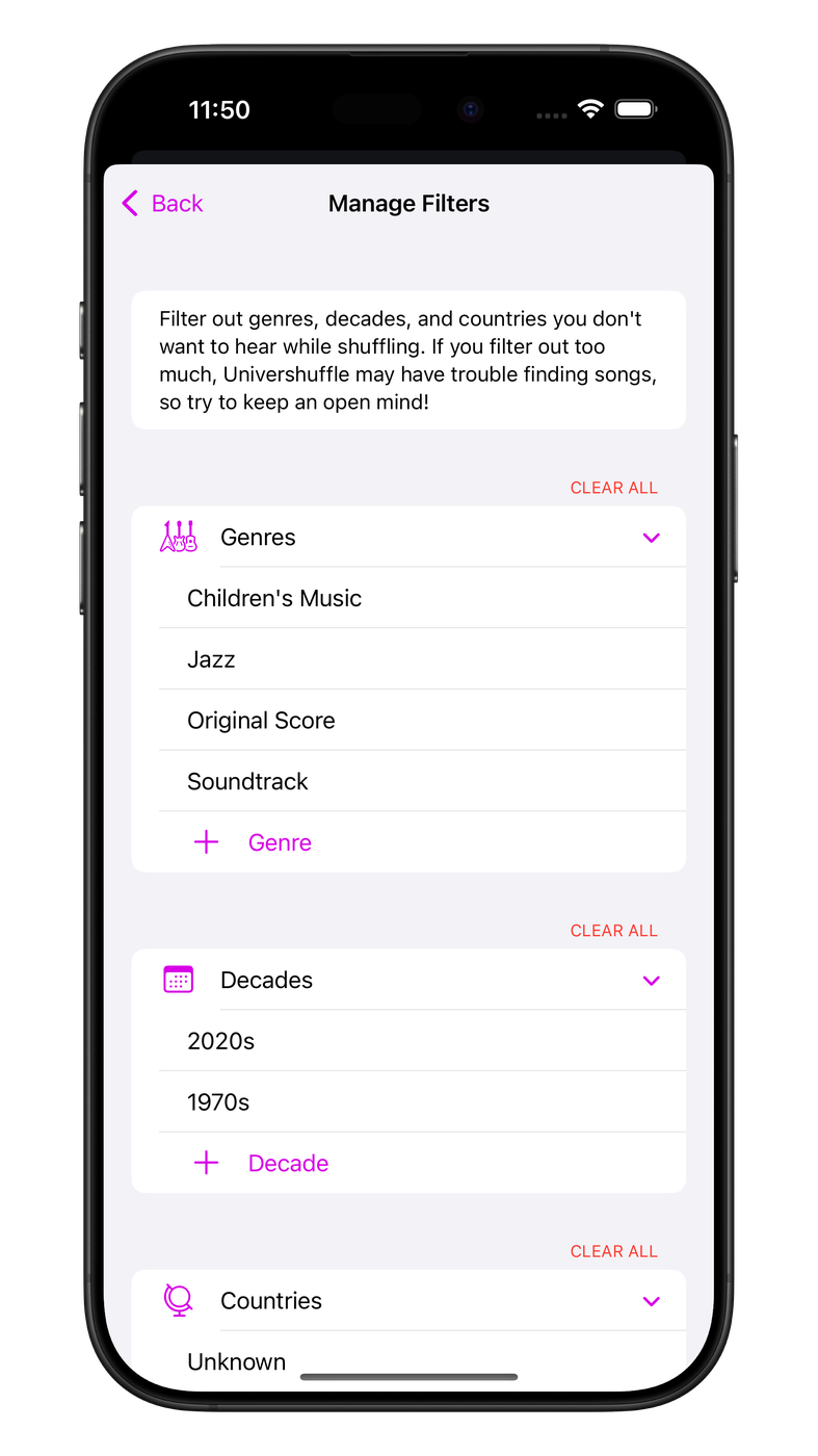 - New filtering options! If you don’t want to hear music from a particular decade or country, you can now filter those alongside genres. This functionality is also available from a new Shortcuts action.