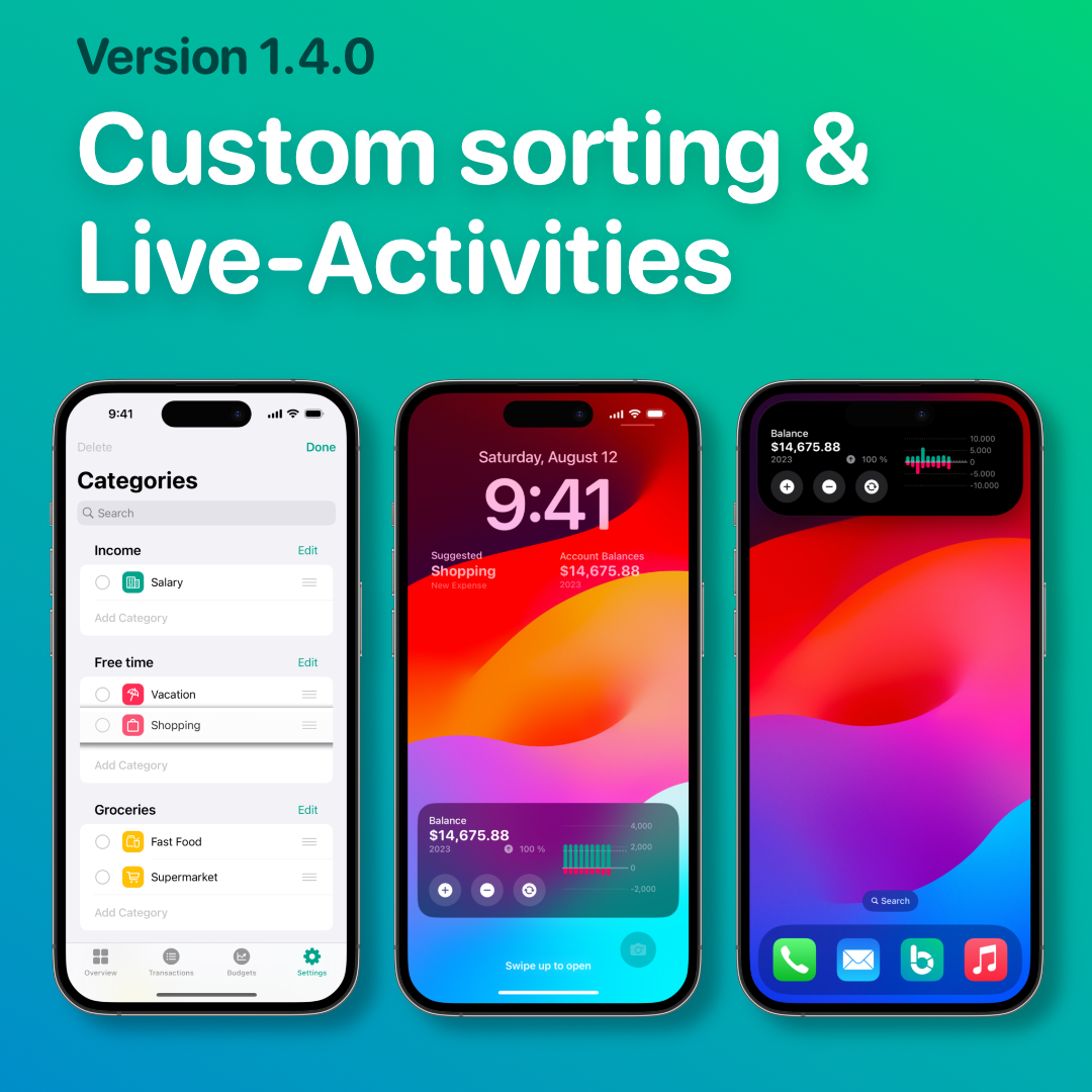 - Added custom sorting of budget books, accounts, categories, folders and reminders